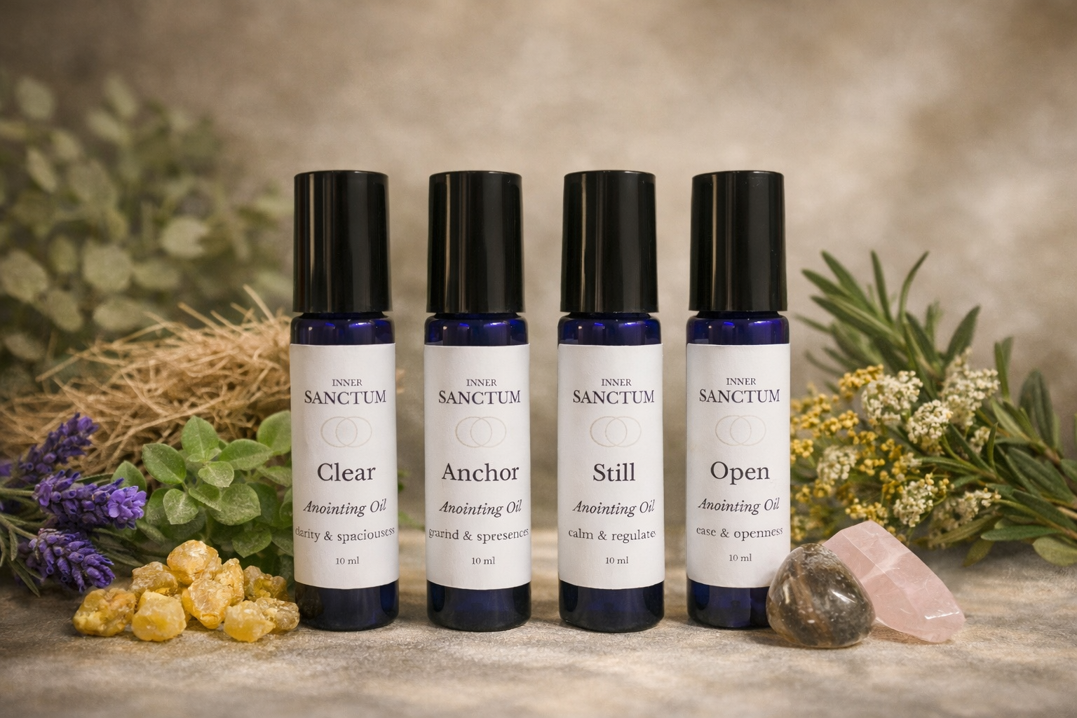 Anointing oils are lightweight, sensory oils designed for pulse-point ritual, scent-supported presence, and subtle nervous-system regulation.