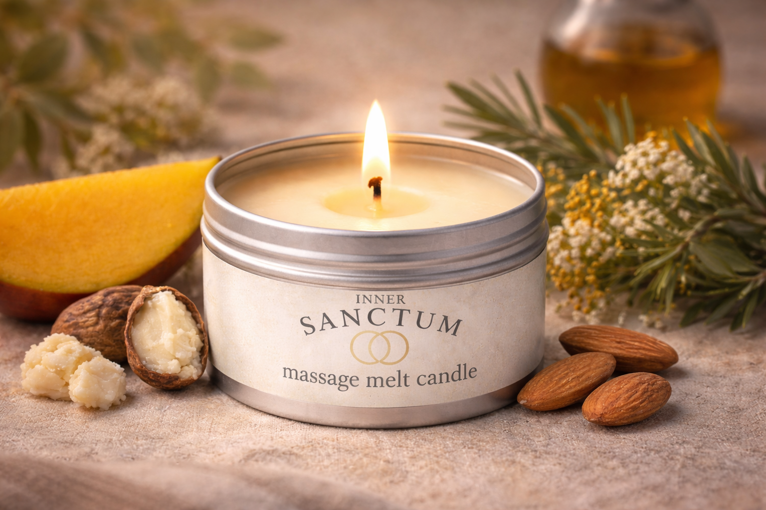 Inner Sanctum is a curated collection of topical body-care tools — massage balms, anointing oils, castor oil blends and massage candles — created for slow, intentional touch and nervous-system ease.